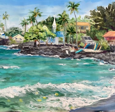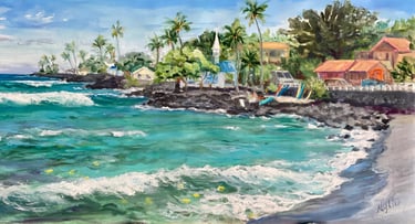 The Big Island, abundant in beauty and history, continues to inspire her work. With over four decades of living in Hawai‘i, Christal has cultivated a deep connection to the land, its stories, and its spirit. Her painterly realistic style reflects her passion for old-style Hawaiian architecture, often evoking a sense of nostalgia. Hawai‘i’s rich culture and diverse landscape—ocean shorelines, lava flows, birds, trees, sunsets, and historic places—provide endless inspiration. Her Kona coffee images honor the heritage and culture of the local coffee industry, celebrating a tradition deeply rooted in the land.